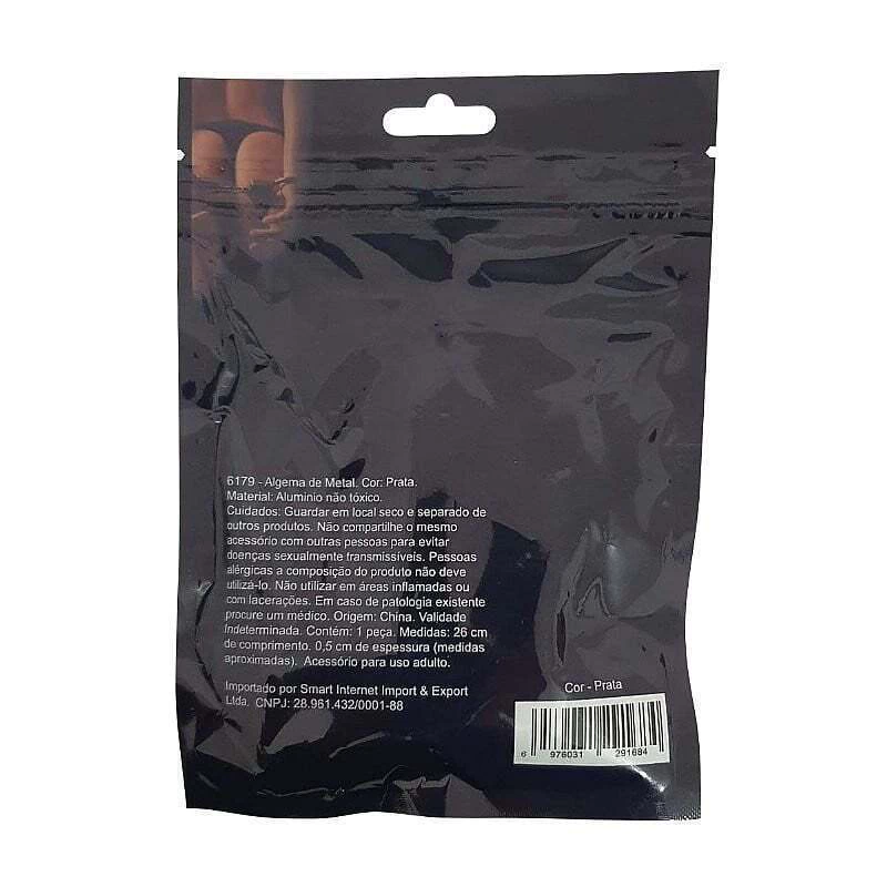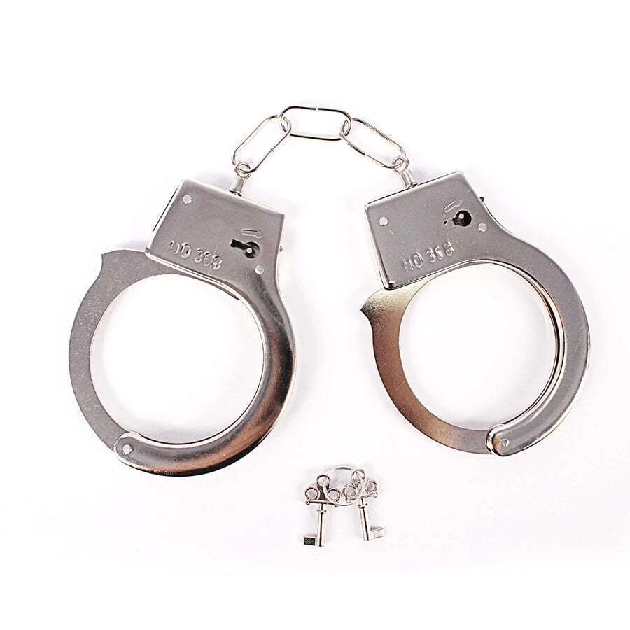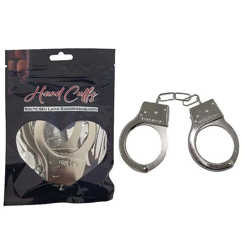 Algema de metal regulável, com duas chaves e dispositivo de soltura. O que permite que as algemas sejam abertas mesmo sem as chaves.