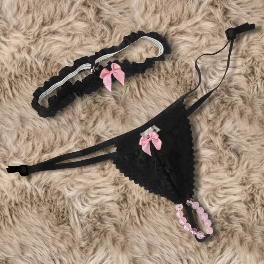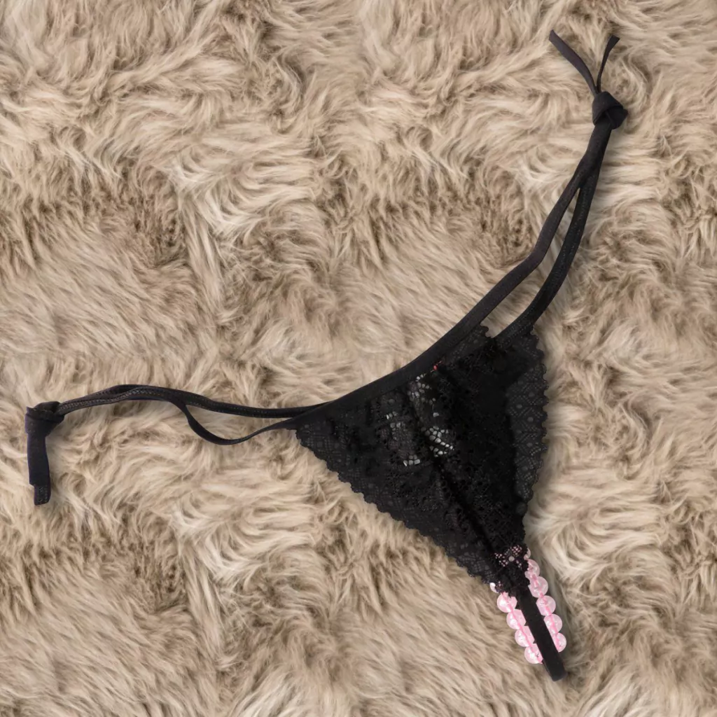 Pensando no prazer do casal, a calcinha é toda trabalhada na renda, seu modelo de fio dental é bem sexy, ela possui pérolas que estimulam o pênis e a vulva ao mesmo tempo.