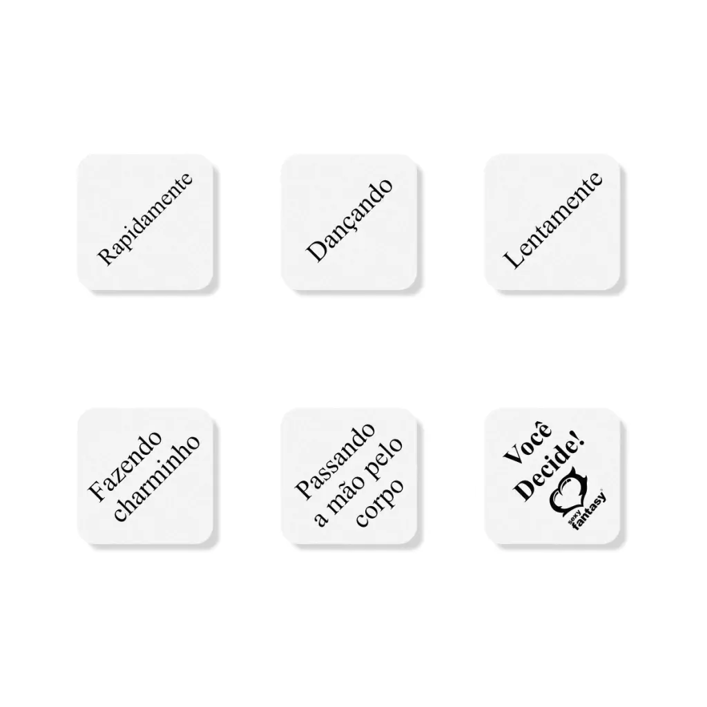MODO DE USO: Pode ser jogado de duas formas. Na primeira forma seu amor joga os dados para que você faça a ação e tire a peça de roupa, já na segunda, você joga os dados para sí mesmo, como um jogo de azar em que todo mundo ganha. Caso os dados caiam em peças que você já tirou, você pode tratá-los como um “passa a vez” ou apenas joga-los novamente. Sua imaginação é essencial para deixar esse jogo ainda mais divertido!