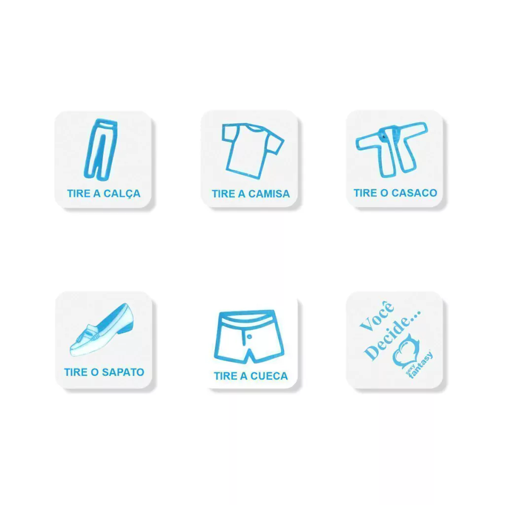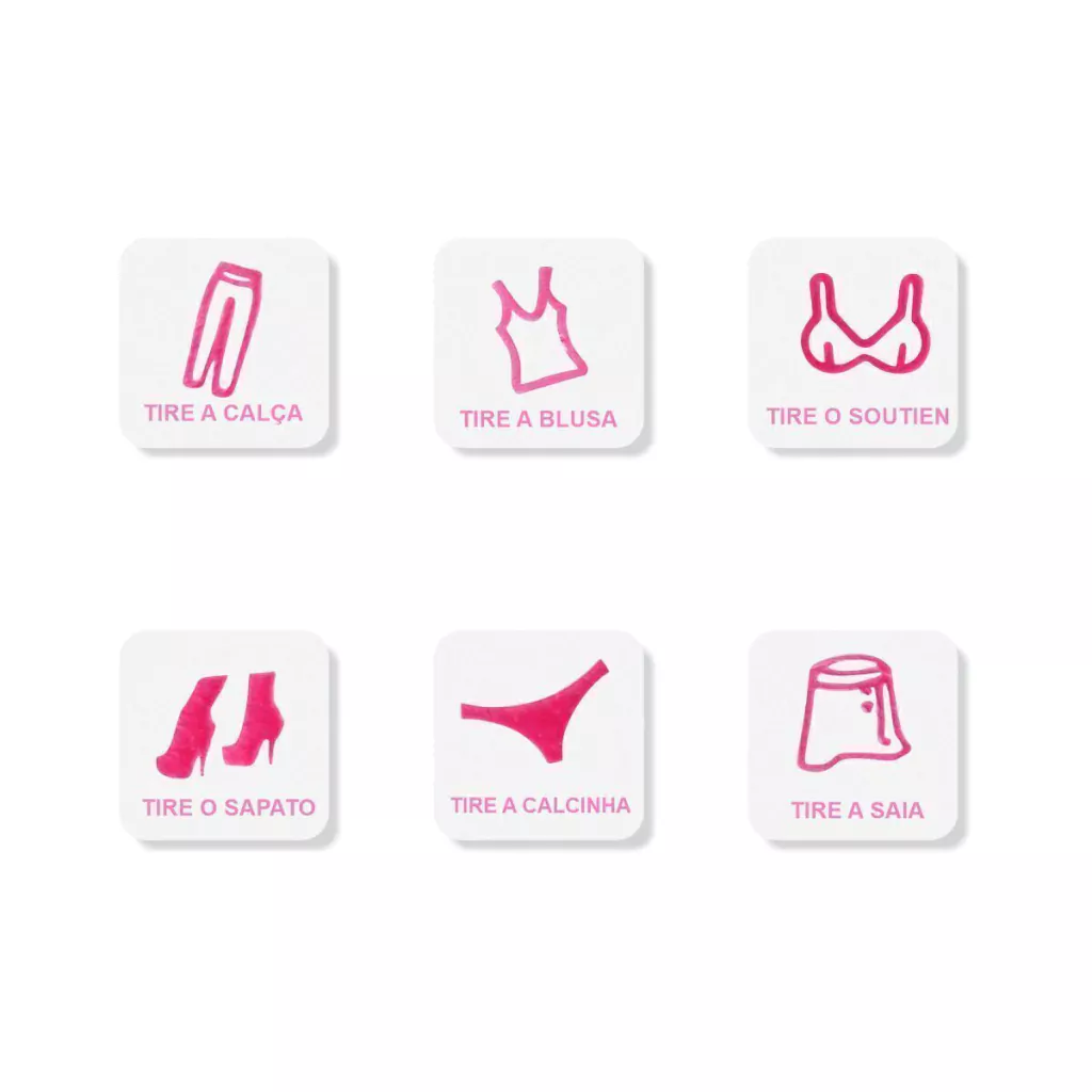O dado de roupas femininas mostra imagens de qual peças você deve tirar, dentre elas: sapatos, saia, calça, soutien, calcinha e a blusa.