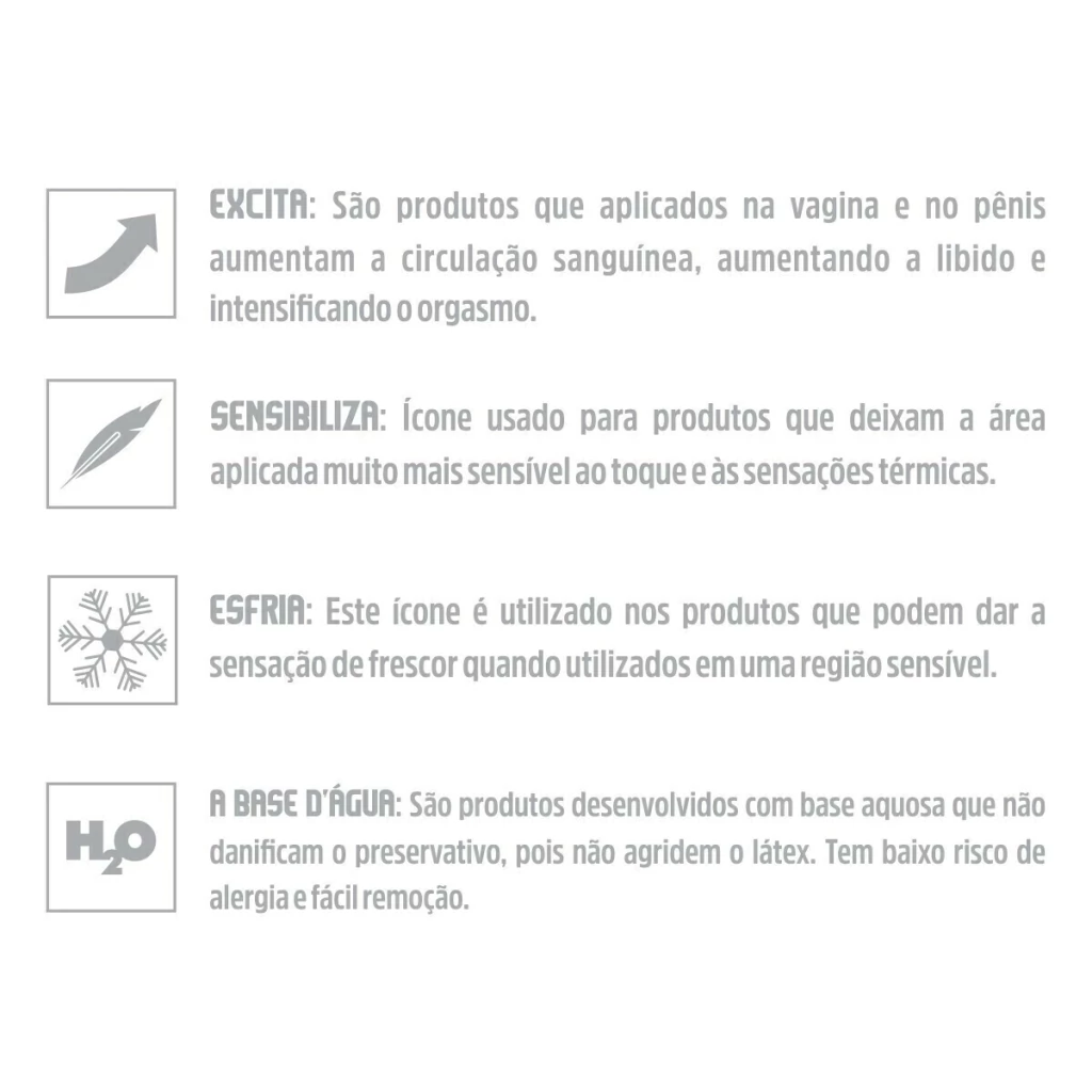 MODO DE USO: Aplique uma pequena quantidade do gel em toda a região íntima (Clitóris, vulva, pequenos e grandes lábios). Utilize 3 a 5 minutos antes da penetração.