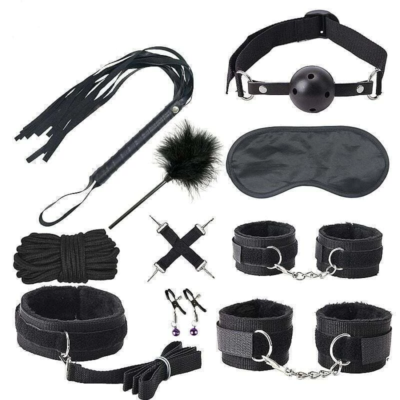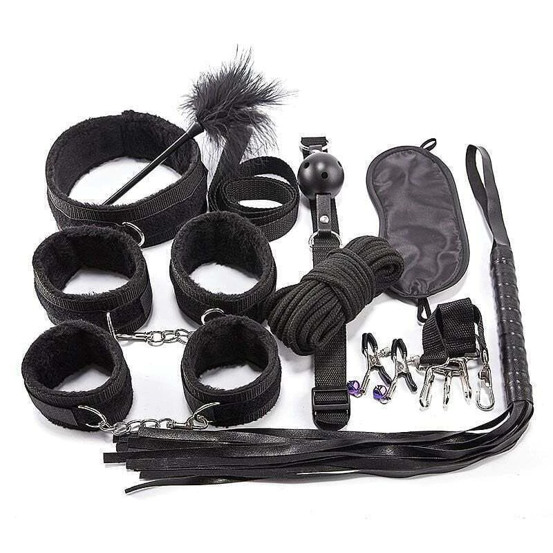 Com venda, mordaça, coleira com guia, chicote, algemas, tornozeleiras e corda de algodão, oferece diversas possibilidades de jogos sensuais e intensos, perfeitos para criar cenários de entrega, dominação e conexão entre os parceiros.