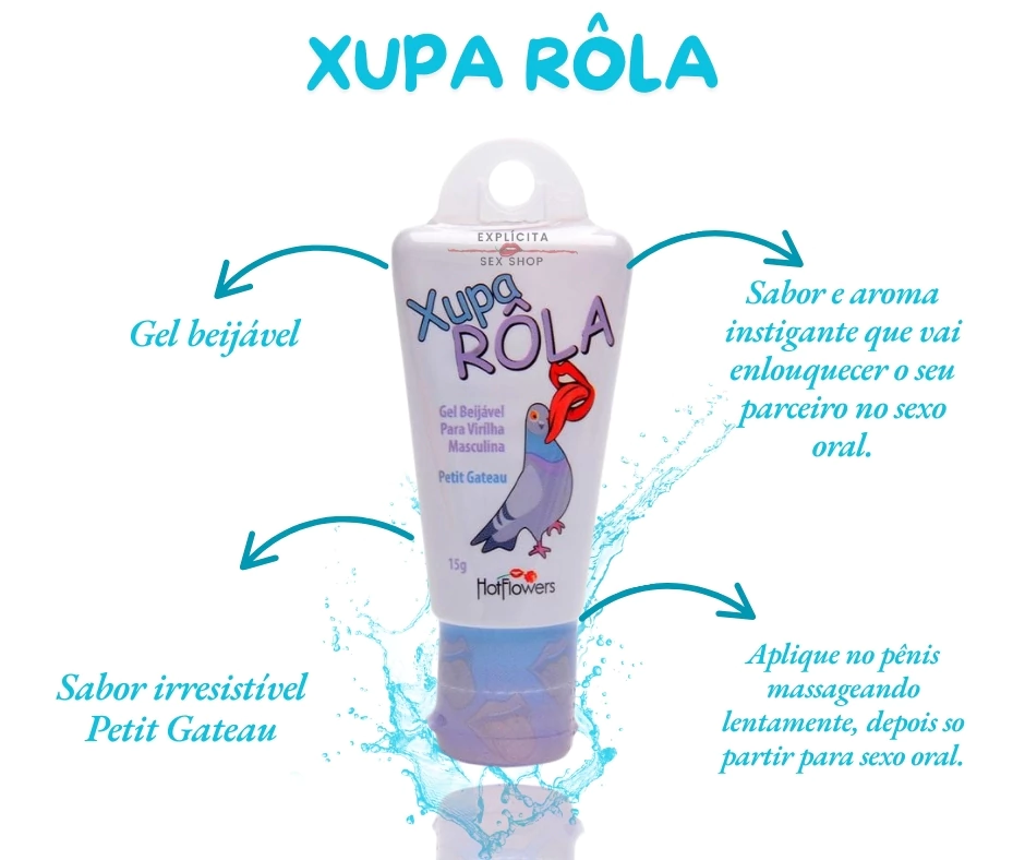 Xupa Rôla (15g): Gel beijável masculino com sabor irresistível de Petit Gateau. Desenvolvido para intensificar o sexo oral, deixando tudo mais divertido, saboroso e prazeroso.