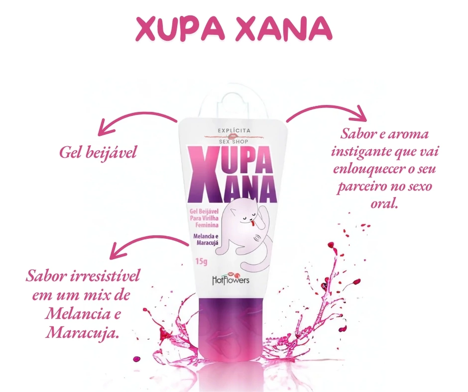Xupa Xana (15g): Gel beijável feminino que estimula a salivação, deixando o sexo oral mais molhadinho e envolvente. Conta com o delicioso sabor de melancia com maracujá.