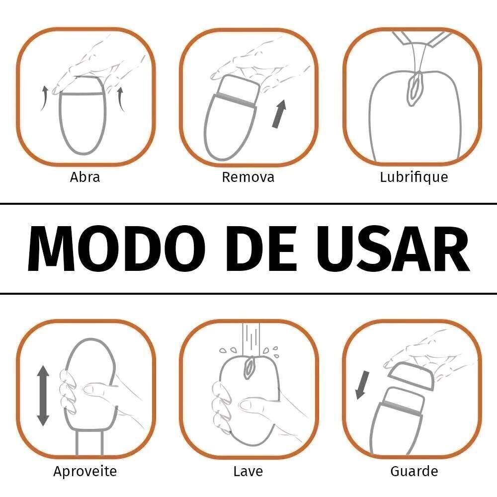 MODO DE USO: Depois de “descascados”, lubrifique o interior do ovo e o encaixe no pênis, como uma touca elástica, a peça pode ser esticada até a base do membro, e a partir daí a masturbação é feita com as mãos sobre ela.