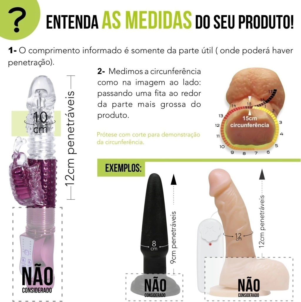 PRECAUÇÕES: Produto erótico sem indicação de uso. Vendido como produto para estimulação sexual. Não nos responsabilizamos por mau uso do produto. Pessoas alérgicas ao PVC não devem usar o produto. Não use em regiões machucadas. Lave antes e após o uso com água e sabão neutro. Seque com toalha de papel ou à sombra. Proteja o controle durante o uso do produto, e retire as pilhas após o uso.